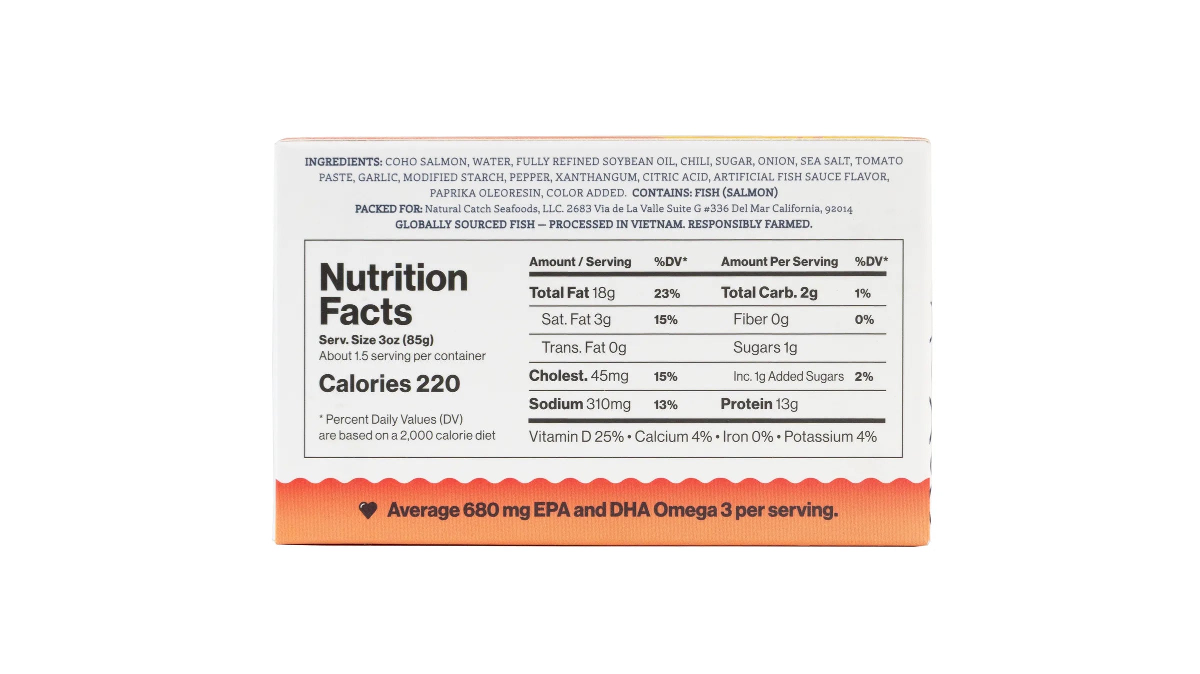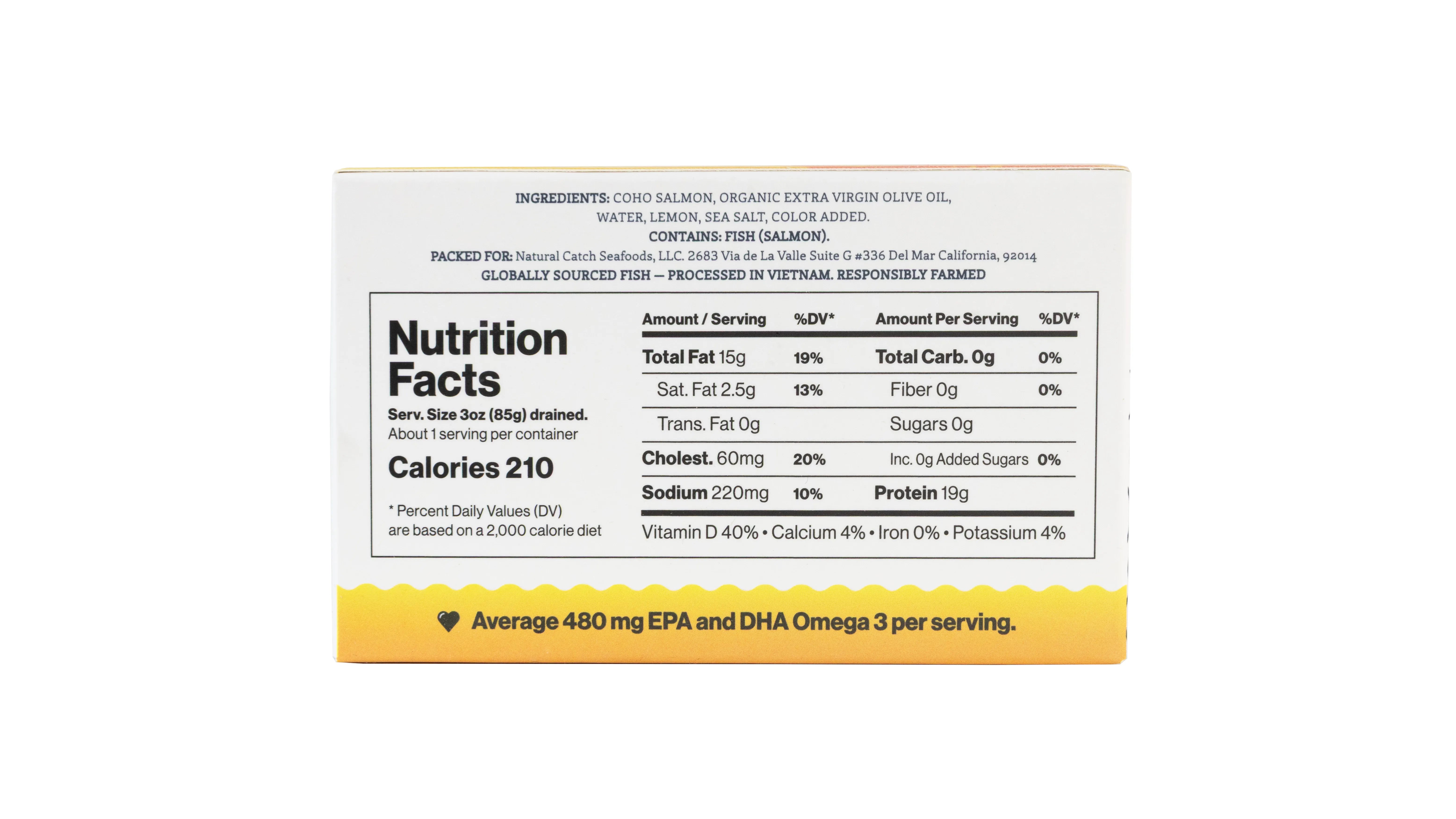 INGREDIENTS: COHO SALMON, ORGANIC EXTRA VIRGIN OLIVE OIL, WATER, LEMON, SEA SALT, COLOR ADDED. CONTAINS: FISH (SALMON)